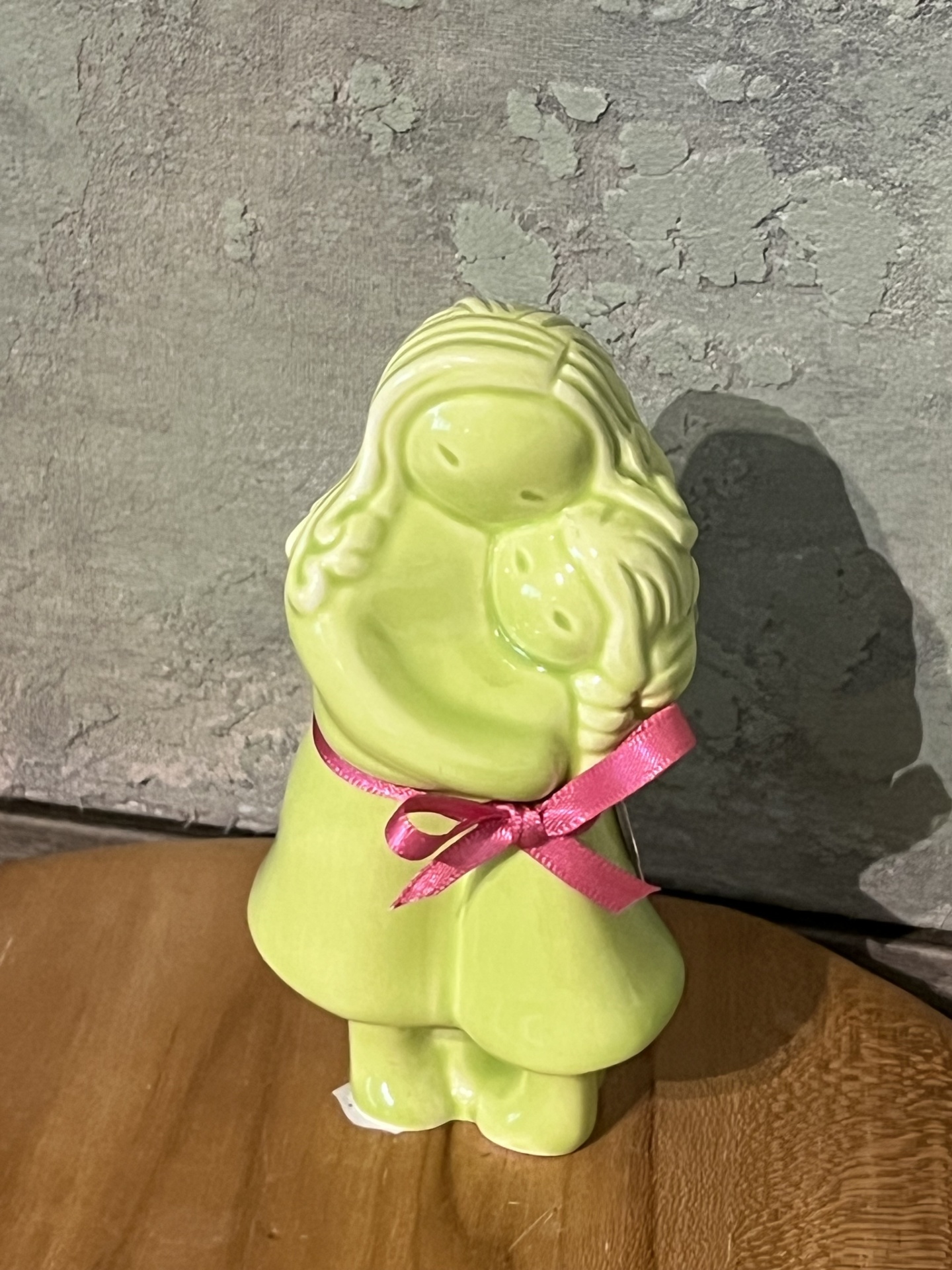 • Escultura verde de cerâmica de duas figuras femininas abraçadas com laço rosa em cenário natalício