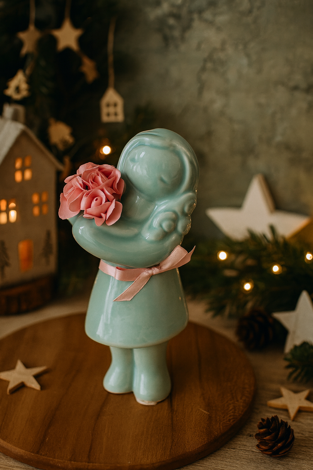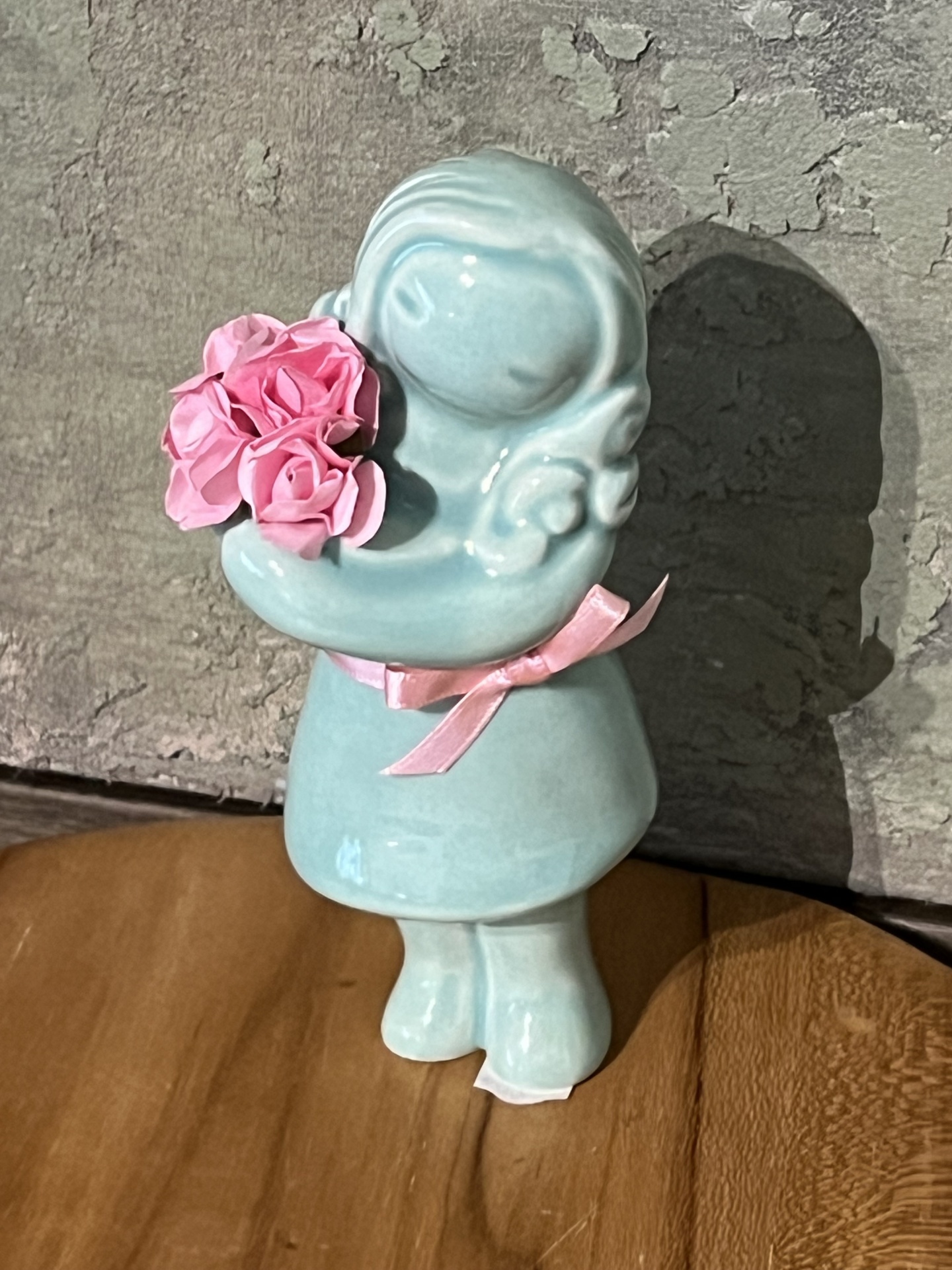 • Figura em cerâmica azul claro segurando flores rosas com fita cor-de-rosa ao pescoço