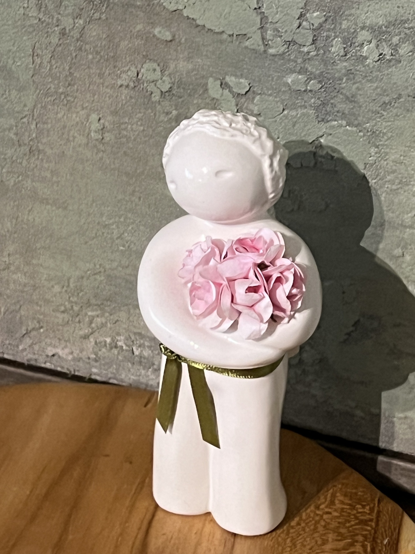 • Escultura branca segurando flores rosas com fita verde numa superfície de madeira