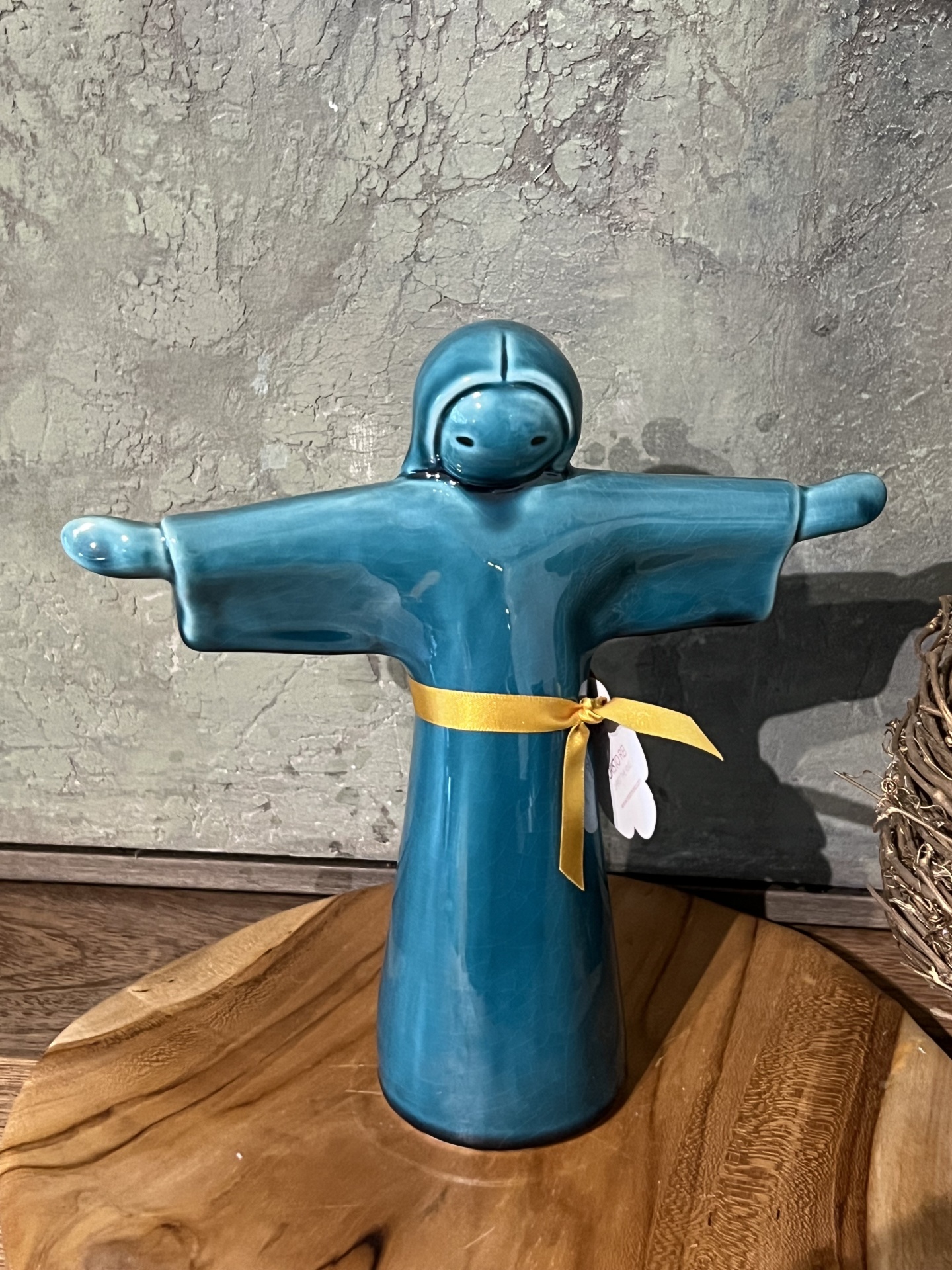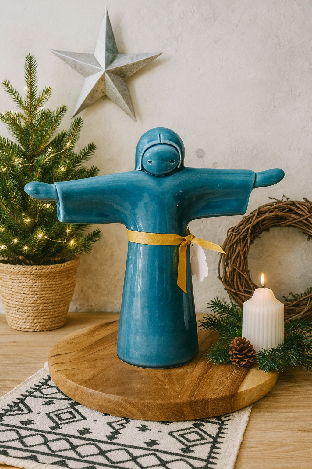 • Estatueta azul em cerâmica com cinto amarelo sobre base de madeira com vela e enfeites de Natal