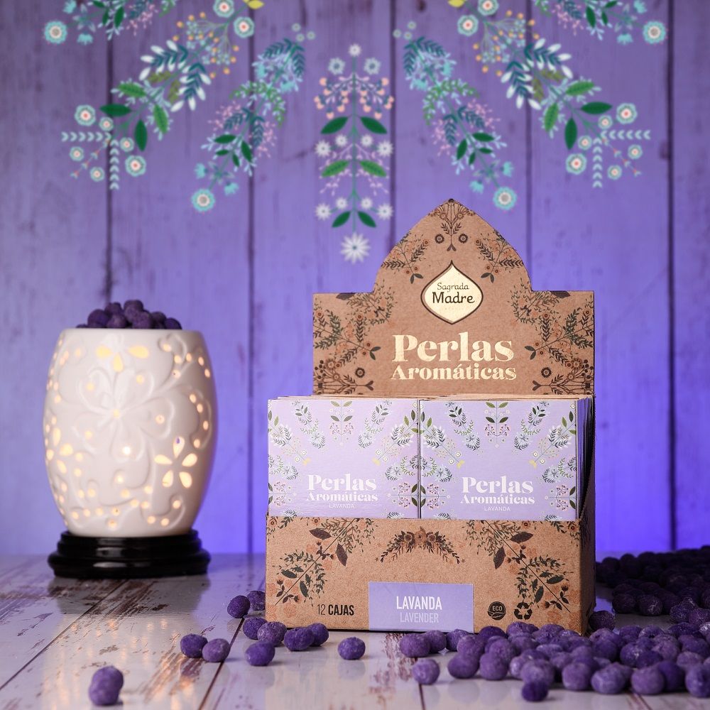 • Perlas aromáticas lavanda Sagrada Madre em caixa decorativa marrom com queimador branco e perlas roxas