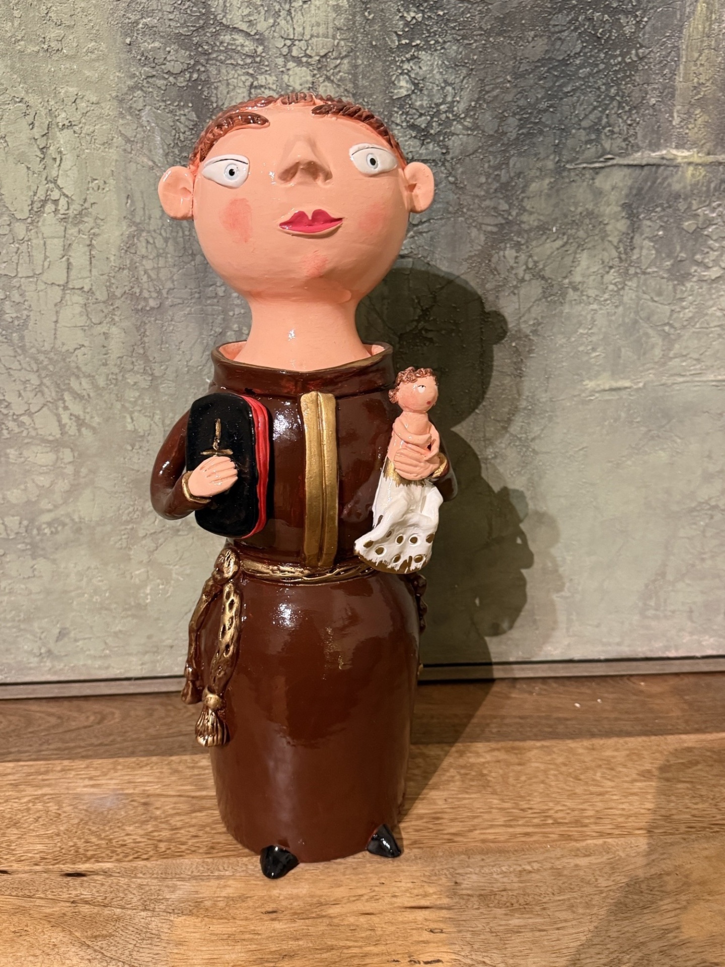 Santo António 60,00 € Desconto de %. Partilhar Comprar Contactar 1 unidades em stock Santo António em barro moldado manualmente . Medidas: 43 cm de altura Artesã: Irene Salgueiro Marca Irene Salgueiro